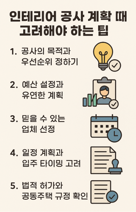 인테리어 공사는 단지 ‘꾸미는 일’이 아니라 생활의 질을 바꾸는 투자입니다. 작은 실수가 큰 후회를 남길 수 있으니, 사전에 철저한 준비와 신중한 결정이 필수입니다. 공사의 목적부터 예산, 일정, 법적 절차까지 미리 고려해 두면, 공사 후 만족도는 훨씬 더 높아질 것입니다. 멋진 공간을 꿈꾸는 만큼, 그 꿈이 현실이 되도록 꼼꼼히 계획해보세요.